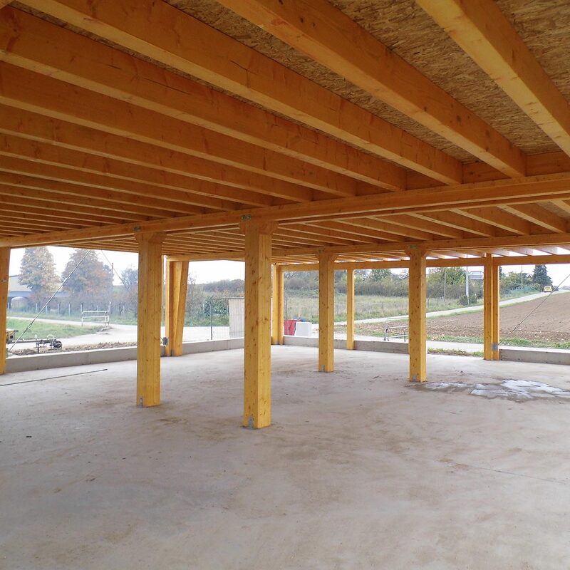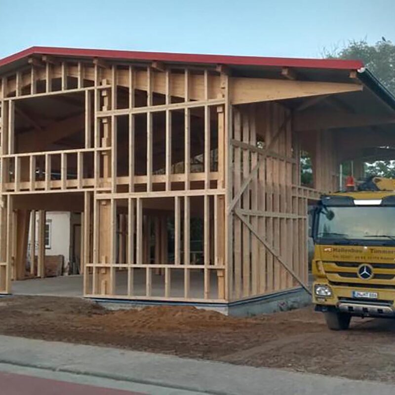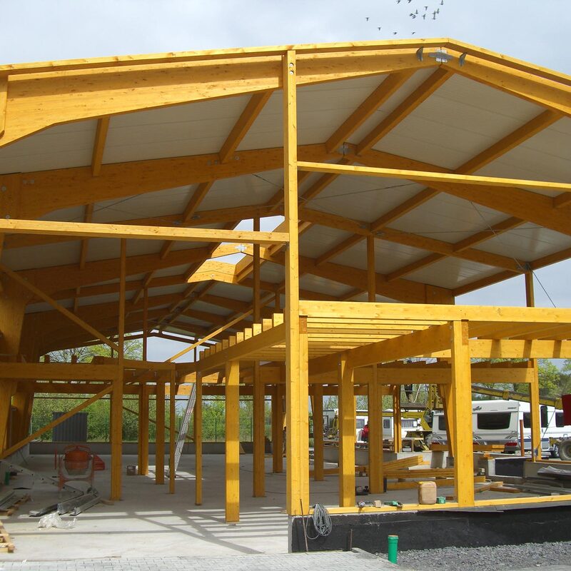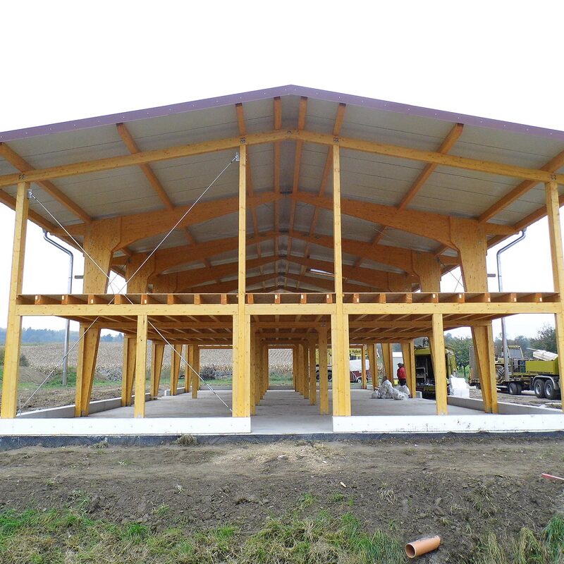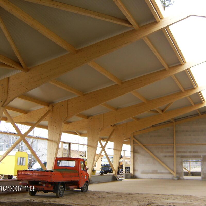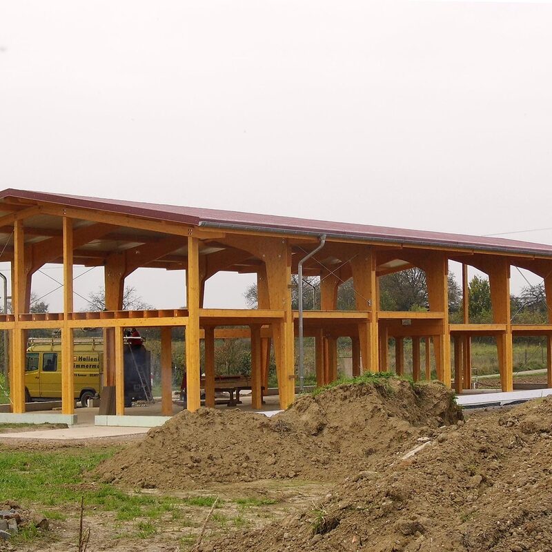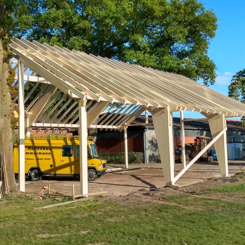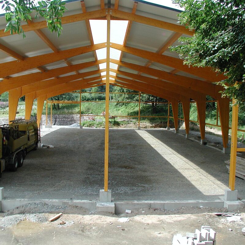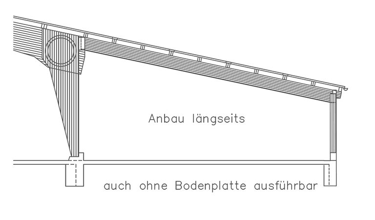Vordächer sind ein- oder beidseitig möglich. Die max. Vordachlänge ergibt sich aus der Hallenbreite. Durch die konstruktive Verbindung ( Stabdübel ) zwischen Binderstütze und Binderriegel lassen sich alle gewünschten Dachneigungen leicht herstellen.
