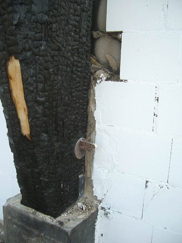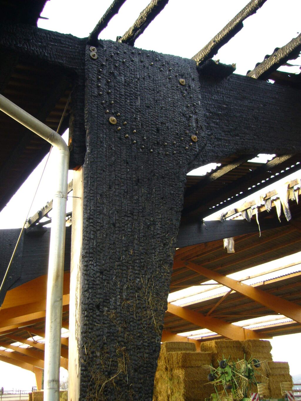 Diese beispielhaften tragenden Holzbauteile zeigen eindeutig die Holzkohleschicht, die den unverbrannten Holzkern vor weiterer Zerstörung schützt und somit die Rettung von Menschenleben und die Sicherstellung wichtiger, kostbarer Güter ermöglicht. Die tragende Konstruktion blieb nach einem Vollbrand stehen.